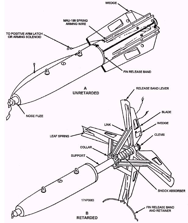 retarded (high-drag) or unretarded (low-drag) bomb delivery capability for the aircraft. The BSU-86/B fin is attached to the Mk 82 or BDU-45/B bomb by eight setscrews. A 25-degree wedge is located at the tips of each fin to impart spin. The airstream drives the fin open rapidly, when the MAU- 199/B spring arming wire (SAW) is activated Fin opening is initiated by the spring load under each fin blade.