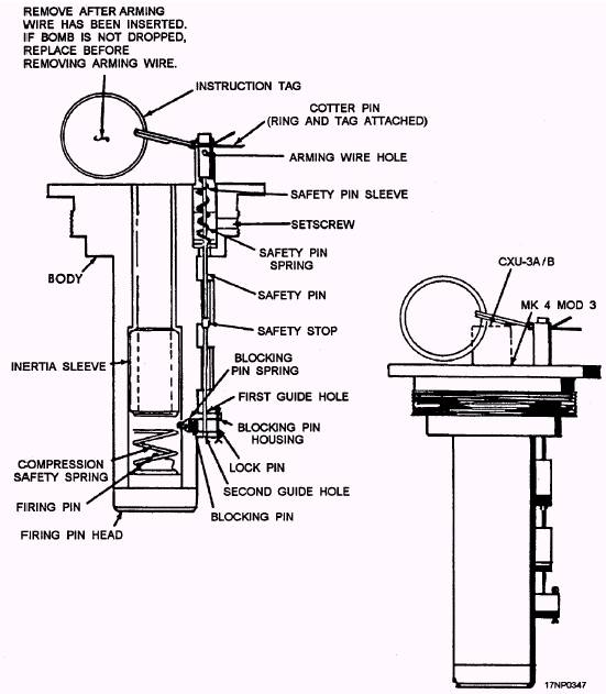 Figure 13-16.-Mk 89 Mod 0 bomb spotting charge adapter. 13-16 1. Ensure threads are not damaged 2. Install nose plug, tighten with spanner wrench or rachet, and tighten nose setscrew. Electric/Electronic TaiI Fuzes Procedures for inspection and installation of tail fuzes FMU-139 and Mk 376 are the same as for GP bombs, as outlined previously in this chapter. Mk 89 Mod 0 Spotting Charge Adapter Prepare and inspect the Mk 89 spotting charge adapter (fig. 13-16) as follows: 1. Remove tape holding cotter pin with instruction tag attached 2. Remove inertia sleeve and compression safety spring by unscrewing firing pinhead from adapter body. 3. Inspect all components, and reject adapter if any components are damaged. Mk 4 and CXU-3 Cartridge Installation Install signal cartridge in spotting charge adapter as follows: 1. Insert inertia sleeve into cavity body. 2. Slide cartridge through inertia sleeve with cartridge rim against forward end of sleeve. 3. Press blocking pin inward until safety pin presses through the second guide hole, locking blocking pin in place. 4. Insert cotter pin through outer set of holes in head of safety pin and safety pin sleeve. Bend leg of cotter pin slightly to hold in place. 5. Place compression safety spring over firing pin head into adapter body and hand tighten. Mk 89 Spotting Charge Installation Install Mk 89 spotting charge adapter with signal cartridge as follows: 1. Verify bomb tail well is clean. 2. Insert adapter in the same manner as electric fuzes. NOTE: The procedures for inspection and installation of nose fuzes and bomb fins are the same as those discussed previously in this chapter for GP bombs. |