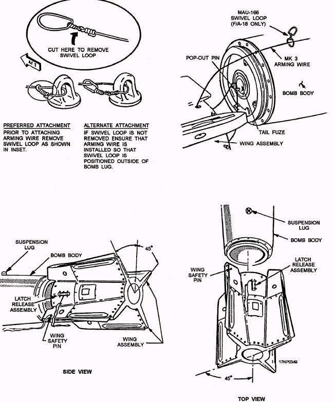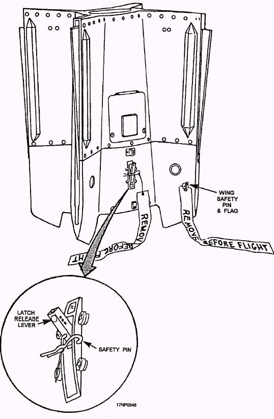 GUIDED-BOMB UNIT (GBU) ASSEMBLY GBUs are general-purpose bombs configured with a wing assembly and a computer control group. Preparation and inspection of the GBUs are the same as the GP bombs, discussed earlier in this chapter, Wing Assembly Installation Install the wing assembly on the bomb as follows: 1. Ensure safety pins are securely installed in latch release lever and collar assembly (fig. 13-17). 2. Remove access covers. NOTE: Refer to figure 13-18 for steps 3 through 8. 3. Attach Mk 3 arming wire to aft suspension lug. 4. Insert arming wire through MAU-166 swivel loop. 5. Orient wings as follows: a. Position GBU-12 and GBU-16 wings in X configuration with the wing release latch mechanism at 9 o'clock, with the bomb lugs at 12 o'clock when viewed from the rear. b. Position GBU-10 wings so that latch mechanism is at 12 o'clock in line with the bomb lugs. NOTE: Mk 3 arming wire installation for the GBU-12 and GBU-16 is the same as for GP bombs, discussed earlier in this chapter. For the GBU-10, install arming wire through hole at the 3 o'clock position of wing and route through pull-out pin/gagrod and pass wire out through hole at 9 o'clock position of wing assembly. 6. Remove safety cotter pin from pull-out pin/gagrod. 7. Keep arming wire taut while pressing the wing against the bomb body. Hand tighten setscrews. 8. Torque setscrews to the required torque.