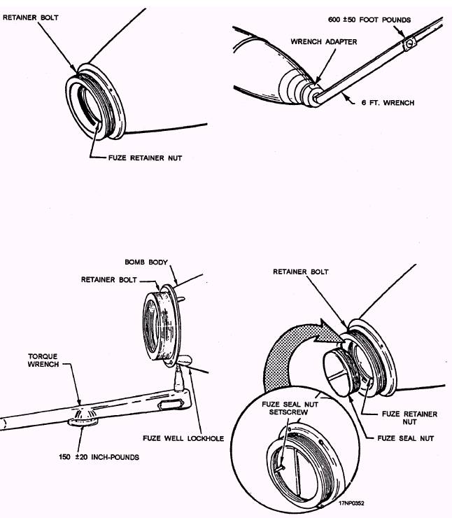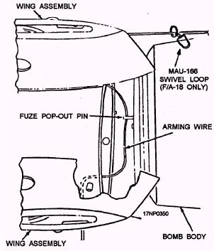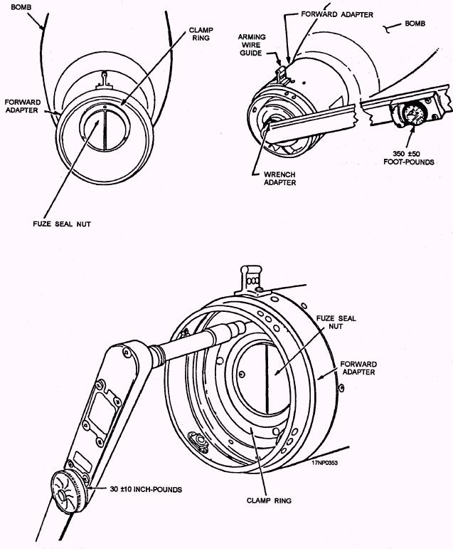 Figure 12-19.-Arming wire installation. 9. Remove the access cover, ensure that no kinks are in the arming wire, and that the wire is not looped around pull-out pin (fig. 13-19). 10. Secure access cover. 11. Wrap arming wire around wing assembly. 12. Mark wing assembly with type of fuze and date installed, fuze safety pin removed, and current date and QA initials. Forward Adapter Assembly Installation Install forward adapter assembly (fig. 13-20) on nose of bomb as follows: 1. Place O-ring on external threads of retainer bolt. 2. Install retainer bolt into nose fuze well (fig. 13-21). 3. Torque retainer bolt to specified torque by using wrench adapter (fig. 13-21). 4. Apply specified torque to setscrew in nose fuze well (fig. 13-21). 5. Install fuze seal nut in retainer bolt and tighten (fig. 13-21) setscrew. 6. Place open end of forward adapter over nose bomb body. Align arming wire guide with suspension lugs on bomb body.