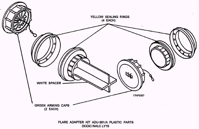 Figure 13-27.-Flare adapter kit. CAUTION When installing Mk 34 and Mk 63 warheads, use the chain wrench only in the area indicated by the decal. This prevents damage to the warhead. NOTE: A groove may be cut in one nylon insert only of the practice warheads Mk 6 Mod 7 and Mk 32 Mod 0. This facilitates assembly of the warhead to the motor. For detailed information concerning the assembly procedures of airborne rockets, you should refer to Airborne Rockets, NAVAIR 11-85-5; 5.0-Inch Airborne Rocket Launchers LAU-10 Series, NAVAIR 11-75A-63; and 2.75-Inch Airborne Rocket Launchers, NAVAIR 11-75A-61. |