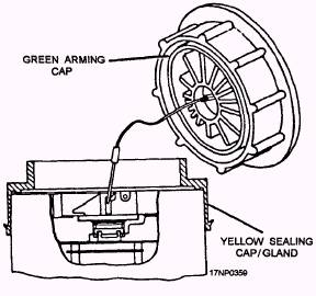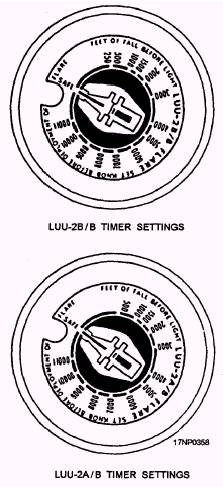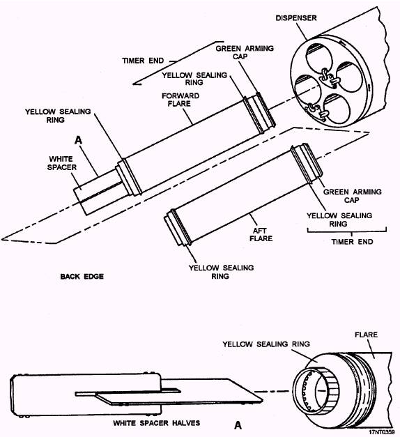 SUU-25 FLARE DISPENSER Perform loading and unloading of the dispenser in authorized areas only. Adapter Kits Install adapter kits on flares as follows: 1. Make sure the timer knob is on safe. 2. Make sure there is no external damage. 3. Check the adapter kit (fig. 13-27) for two green arming caps with serviceable arming lanyards, one white two-piece spacer, and four yellow sealing rings. 4. Rotate the time knob (fig. 13-28) to required setting. 5. Install yellow sealing ring on each end of flare. 6. Connect green arming cap lanyard (fig. 13-29) to timer knob. 7. Install green capon yellow sealing ring.
