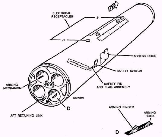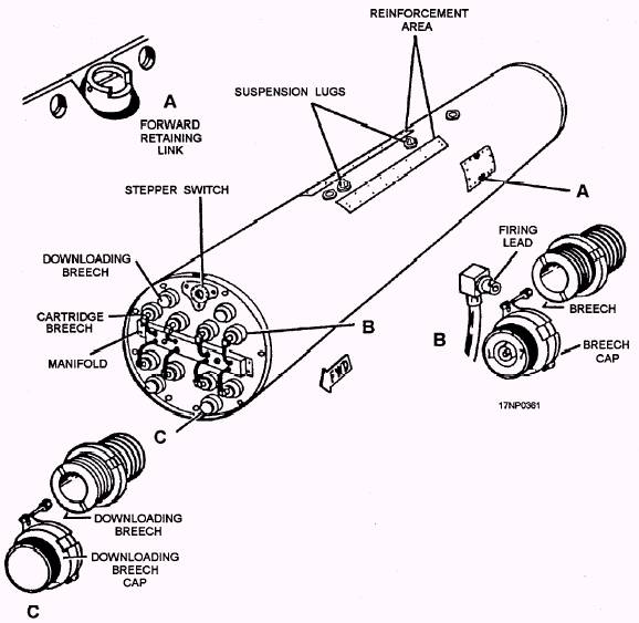 Figure 13-32.-SUU-25F/A downloading breeches. handling ammunition. These regulations may be general in nature or step-by-step procedures. Regardless of the situation, safety precautions must NEVER be ignored or bypassed, even during the simplest ammunition-handling evolutions. If you are involved in weapons assembly, always review the applicable safety precautions before beginning the evolution. A few of these general safety precautions are as follows: 1. Fuze or defuze (electric fuzes only) bombs in handling rooms or spaces specifically designed for such purposes. 2. Normally, mechanical nose-fuzed, highexplosive bombs are fuzed after the weapon is loaded on the aircraft. When the aircraft is carrier based, it must be spotted on the flight deck. Exceptions to this rule are authorized when loading bombs that require special fuzing RADHAZ susceptible units, integral fuzing, and all-up-rounds. 3. Detonators, boosters, primers or other firing devices aren't assembled in or removed from bombs unless specifically prescribed for the weapon. 4. Fuzes aren't allowed to accumulate at the fuzing stations. Never stockpile fuzes. They must be withdrawn from stowage on an as needed basis. 5. Never, under any circumstance, try to disassemble or repair a fuze. Also, never try to render inert a live, loaded item of ordnance. 6. Except as authorized by current directives, no attempt should be made to disarm a fuze. 7. Move assembled rocket ammunition to the designated storage area as soon as practicable after completion of assembly operations. 8. Don't make changes or additions to any ordnance or ordnance components without explicit authority from the Naval Air Systems Command. 9. Exercise particular caution when handling rocket motors to avoid propellant grain damage or fracture. 10. Don't connect electrical power or test equipment to a rocket launcher when rockets are installed. 11. Assemble and fuze airborne rockets in a designated assembly area and as close to the time of aircraft rearming as possible. |