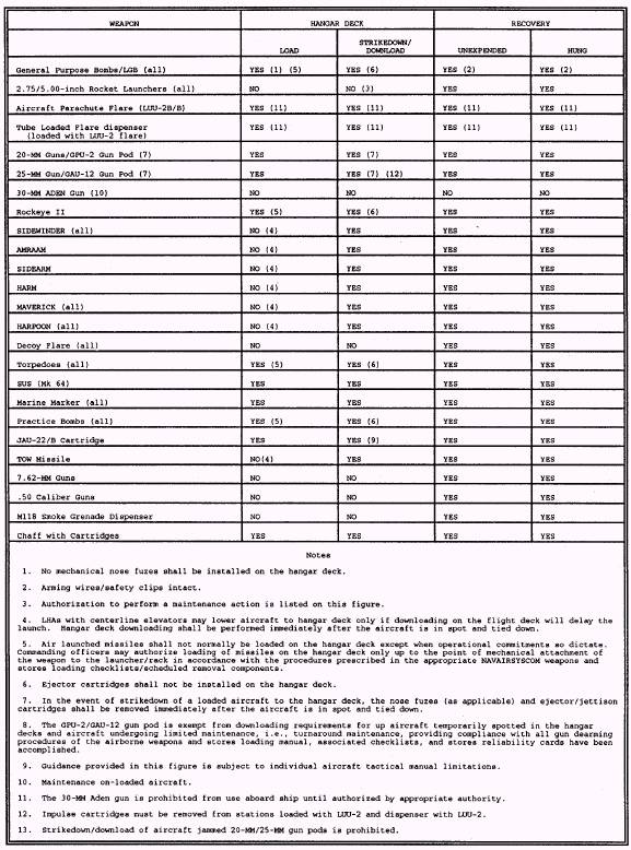 CHAPTER 14 - AIRCRAFT LOADING AND UNLOADING PROCEDURES After aircraft ordnance and ordnance accessories have been tested, they are approved for carriage and for release by a particular model aircraft. Information about ordnance and ordnance accessories can be found in the aircraft's Naval Air Training and Operating Procedures Standardization (NATOPS) flight/tactical manual. This manual is the basic authority for the types of ordnance and ordnance load combinations on each model aircraft. Deviation (change) from the basic authority must be approved before it can be made. The authority that approves deviations is the Naval Air Systems Command (NAVAIR). The types of aircraft ammunition and armament equipment were covered in previous chapters. In this chapter, you will learn about loading and unloading ammunition and other armament equipment onto the aircraft. AIRBORNE WEAPONS/STORES LOADING MANUAL LEARNING OBJECTIVE: Identify requirements in airborne weapon/stores loading manuals as they pertain to loading and unloading aircraft ashore and afloat. The Airborne Weapons/Stores Loading Manual, known as the Loading Manual, standardizes loading procedures used throughout the Navy and Marine Corps. It improves safety and reliability in the loading of conventional weapons and airborne stores. You must follow the loading procedures in the Loading Manual. If there is a conflict between the Loading Manual and another publication, follow the procedures in the Loading Manual until NAVAIRSYSCOM solves the conflict. The procedures in the Loading Manual are followed during aircraft loading. However, the physical size of the manual makes it impractical for use on the flight line. Therefore, the actual aircraft loading procedures for a weapon/store are condensed into an airborne weapons/stores checklist. An individual checklist is provided for each type of weapon/store to be loaded. This includes release and control system checks, retarded/nonretarded bombs, fire bombs, pyrotechnics, and laser-guided bombs. Each member of the loading crew does not need a copy of a checklist during loading operations. However, crew leaders MUST use a checklist for the particular weapon/store being loaded. Checklists are not complete guides. They must be used only by experienced crew leaders that have thorough knowledge and understanding of the loading manual. Each checklist contains a required reading section that each member of the loading crew must understand before starting loading operations. To keep these loading manuals and checklists current, you should use the Airborne Weapons/Stores Publication Index, NAVAIR 01-700. This index provides activities with a guide that lists all existing changes or revisions for aircraft conventional weapons loading, release and control, airborne weapons support equipment (AWSE), chemical, and weapon assembly or disassembly checklists and manuals on hand. This publication index is updated quarterly. ASHORE, LPH, LHA, LHD, AND CV NATOPS MANUALS LEARNING OBJECTIVE: Identify the requirements in airborne weapons/stores loading manuals and the NATOPS manuals. The NATOPS manuals are issued by the authority of the Chief of Naval Operations (CNO) in conjunction with the Naval Air Training and Operating Procedures Standardization (NATOPS) program. The NATOPS manuals contain the best available operating instructions for most circumstances. The NATOPS is regulatory in nature; however, operational necessity may require modification of the procedures contained in it. TERMS When you are involved in weapons loading and flight deck or flight line operations, there are certain weapons terms that you must know. Some of the more common terms are contained in Appendix I of this training manual. WEAPONS HANDLING PROCEDURES Airborne weapons handling evolutions (loading/unloading) introduce a degree of risk into shore based and carrier based operations. They require careful planning and preparation. The necessity to train for and conduct combat operations creates risks that cannot be avoided when explosive weapons are handled. Weapons Loading and Downloading The flight deck of an aircraft carrier is the preferred area to load or download an aircraft. Normally, the rearming area is adjacent to and aft of the island structure on the flight deck. When operationally necessary, however, the ship's commanding officer (CO) may authorize loading or downloading on the ship's bow while cyclic flight operations are in progress. Only a minimum quantity of weapons should be moved toward the ship's bow. Loading limited amounts of weapons on the hangar deck may be authorized by the CO when operationally necessary. However, this adds an additional risk of fire because there is both fuel and explosives in a confined area. Only aircraft scheduled for the next launch or an alert condition are authorized for loading on the hangar deck. Authorization is also restricted to the particular weapons shown in table 14-1. According to the CV NATOPS Manual, fueling, loading and downloading weapons, and installing fuzes and arming wires simultaneously are authorized. However, you can't load forward-firing ordnance that requires simultaneous and/or prior electrical connections for loading while aircraft fueling is in progress. Don't make other electrical connections to weapons or remove/install impulse cartridges while aircraft are being fueled. Don't position the fuel hoses under the weapons/stores being loaded/downloaded. When required, you may apply electrical power to the aircraft during a loading/downloading evolution. However, it should be held to a minimum, and it should be consistent with operational requirements. Don't apply electrical power to the armament or weapon release-and-control circuitry while weapons are being loaded/downloaded. Conduct loading/downloading weapons and oxygen servicing (other than the converter replacement at the aircraft) as separate evolutions. Arming and Dearming Arm airborne weapons in the designated r