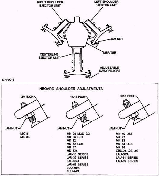 Figure 14-4.-IMER/ITER sway brace preset adjustment. 14-10 When the parent rack is ready to be loaded, position the weapon and the handling and loading equipment under the loading station. If applicable, prepare the weapon for bomb hoist loading by installing a hoisting sling on the bomb for single store hoisting. Then, you can install the bomb hoist on the parent rack and attach the hoist cable to the hoisting sling. Remove slack from the cable by operating the hoist. (Remember, one person is positioned at the front and one at the tail of the weapon to steady it while it is being hoisted.) Remove the tie-down straps that secure the weapon to the handling equipment. If applicable, install a manual hoisting bar for manual loading by installing the HLU-256/E manual hoisting bar in the fuze well. Then, remove the weapon tie-down straps that secure the weapon to the handling equipment. Now, the bomb hoist can be used to load the weapon, If you use an electric fuze, hoist the weapon to about 10 inches below the rack connect the Mk 122 arming safety switch quick-disconnect connector (fig. 14-5) to the parent rack arming receptacle. Then, continue to hoist the weapon until both suspension lugs enter the suspension hooks, and the hooks latch. Visually inspect the hook lock indicators on parent racks for a hook locked indication on each set of hooks being used. Slack the hoist cable and shake the weapon gently to make sure it is supported by the suspension hooks on the IMER/ITERs lock safety stop levers.