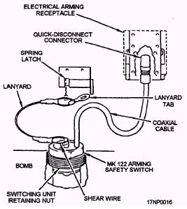 Figure 14-5.-Mk 122 arming safety switch. When you have finished loading the weapon on the parent rack, remove the manual hoisting bar or the bomb hoisting unit. Then you can adjust the sway braces by taking the following actions: NOTE: Unused sway braces should remain in the full up position with the jam nuts tightened. Adjust the sway brace adjusting screws until the sway brace pads contact the weapon. Simultaneously tighten the forward right and aft left sway brace screws one-quarter turn with a suitable wrench. Simultaneously tighten the forward left and aft right sway brace screws one-quarter turn. NOTE: If all sway brace screws cannot be tightened one-quarter turn on final tightening, ensure the same amount of turn is applied to each sway brace screw. The total tightening of each sway brace screw should not exceed one-half turn. Tighten the jam nuts with a suitable wrench. Next, you should adjust the ejector foot down until it makes contact with the weapon. Then back off to the first detent. Then, if applicable, install the nose fuze or TDD. Once fuzes are installed, you can install cartridges in all loaded IMER/ITER breech chambers. Screw the breech caps on all IMER/ITER breech chambers and hand tighten the breech caps. Then, install cartridges and tighten breech caps on parent rack. Verify that unloaded IMER/ITER suspension hooks are open. Place a WEAPON LOADED sign in the cockpit. Remove tools and handling or loading equipment from the area. Weapons are loaded on an IMER/ITER in much the same way as on a parent station. The major differences are as follows: After the weapon lugs have engaged the rack suspension hooks, the safety stop lever must be locked. The ejector foot must be positioned down against the weapon. |