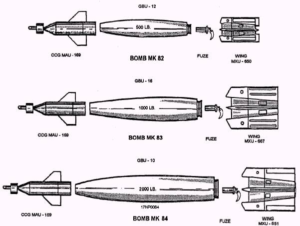 LEARNING OBJECTIVE: Identify the different types, purpose, use, and operation of guided bomb units. GBU-12, GBU-16, AND GBU-10 The GBU-12, GBU-16, and GBU-10 guided bomb units (GBUs) (fig. 1-33) are Mk 82, Mk 83, and Mk 84 LDGP bombs modified to detect a target illuminated by a laser beam. The modification consists of a MAU-169 series computer control group (CCG) and MXU-650, 651, or 667 series airfoil group (AFG). Each AFG contains identical items; although they are different in physical size, they perform identical functions. A typical AFG is composed of a folding wing assembly,