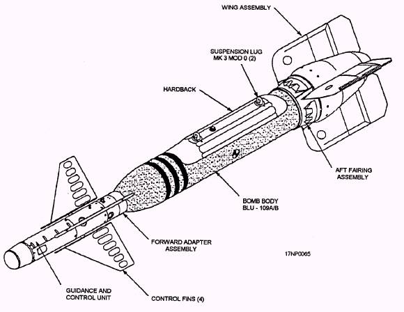 Figure 1-33.-Typical guided bomb unit configurations. forward adapter assembly, guidance fins, and hardware required for assembly of laser-guided weapons. The CCG mounts on the nose of the bomb body (this precludes the use of nose fuzing). The CCG detects a laser-illuminated target and provides weapon guidance signals to the moveable guidance fins. The guidance fins (canards) attach to the CCG and the forward adapter assembly. The canards react to the signals received from the CCG to direct the weapon to the target. The canards are issued with fin extenders, which may be snapped off if wing extenders are not required. The wing assembly is mounted on the aft end of the bomb body. It adds necessary aerodynamic stability and lift for in-flight maneuvering. An electric tail fuze is installed in the tail of the bomb. Except for the glass nose of the CCG, all components are painted olive drab, and the bomb body has standard LDGP markings. GBU-24B/B The GBU-24B/B (fig. 1-34) is a converted BLU-109A/B 2000 pound class bomb designated as a hard target penetrator (HTP). The associated components required for conversion are fuze, air-foil group, FZU generator, adapter group, and guidance control unit. The heavy walled case of the bomb provides the penetration capability of 4 to 6 feet of reinforced concrete. The GBU-24B/B has a thermal protective coating applied to the surface to extend the cook-off time. The GBU-24B/B must not be missing more than 20 square inches of thermal coating in a single area or more than 40 square inches total.