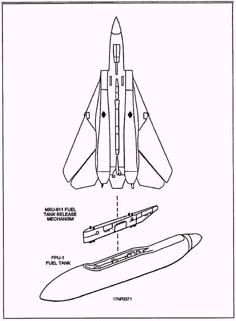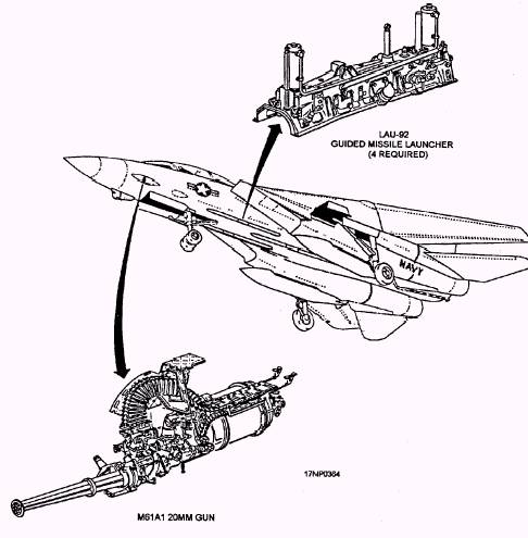 Multiple Weapons Release System The multiple weapons release system has basic controls and components and multiple weapons system controls and components. They are discussed in the following paragraphs. The bomb release and rocket control systems enable selecting, preparing, and delivering of the air-to-ground stores. Weapons that can be carried on stations 3R, 4R, 5R, and 6R range from general-purpose bombs of various sizes to CBU, and GBUs. M61A1 20-MM Automatic Gun Fire Control System The M61A1 20-mm automatic gun fire control system enables selecting, arming, and firing of the gun. Depending upon the mission objective, the gun fire control system can be operated in an air-to-ground (A/G), air-to-air (A/A), or air combat maneuver (ACM encounter) mode. Two attack modes of operation are available-computer pilot attack mode and manual attack mode. The computer pilot attack mode operates with the weapon control system, command signal decoder system (CSDC), and the vertical display indicator system to display target data. The manual attack mode is used primarily as a backup mode to provide a manually controlled sight reticle if a system malfunction occurs. GUN RATE SWITCH. The GUN RATE switch (fig. 15-1) is located on the ACM panel. It is a two-position, push-button, indicator switch that selects HIGH (6,000 rounds per minute) or LOW (4,000 rounds per minute) rate of fire. This switch is only active in the A/G and A/A modes. A/G GUN SWITCH. The A/G GUN switch (fig. 15-2) is located on the armament control indicator panel. It is a two-position toggle switch that enables or inhibits a mixed bomb and gun mode operation. The MIXED position enables bomb and gun mode operation while the OFF position inhibits it. GUN CONTROL UNIT. The gun control unit, located above the gun barrels, contains the BURST selector switch. This switch limits the number of rounds that can be fired per burst (50, 100, or 200), or it permits unrestricted firing (MAN position). HOOK/GUN PANEL. The HOOK/GUN panel, located on the forward cockpit vertical console, contains the gun rounds counter. This counter provides a digital countdown readout of the rounds remaining. The F-14 aircraft uses the AN/ALE-39 decoy dispensing system. The CHAFF/FLARE DISPENSE panel is located on the aft cockpit right side console. The MANUAL DISPENSE switch on the CHAFF/FLARE DISPENSE panel is used to initiate rounds from the aft cockpit. Rounds can also be initiated from the forward cockpit by the decoy dispense push button on the control stick. Jettison System The jettison system allows jettison of certain external stores. There are four jettison modes: 1. Emergency, which is pilot controlled 2. ACM encounter, which is NFO selected and pilot controlled 3. Selective, which is NFO controlled 4. Auxiliary, which is NFO controlled (BRU-32 air-ground weapons) In all modes, arming and fuzing is disabled during jettison operations. The landing gear handle must be UP for ACM encounter, selective, and auxiliary jettison modes. Aircraft Armament Configuration Capabilities The basic armament configuration (fig. 15-3) of the F-14 aircraft consists of four fuselage-mounted LAU-92