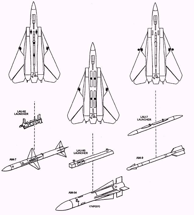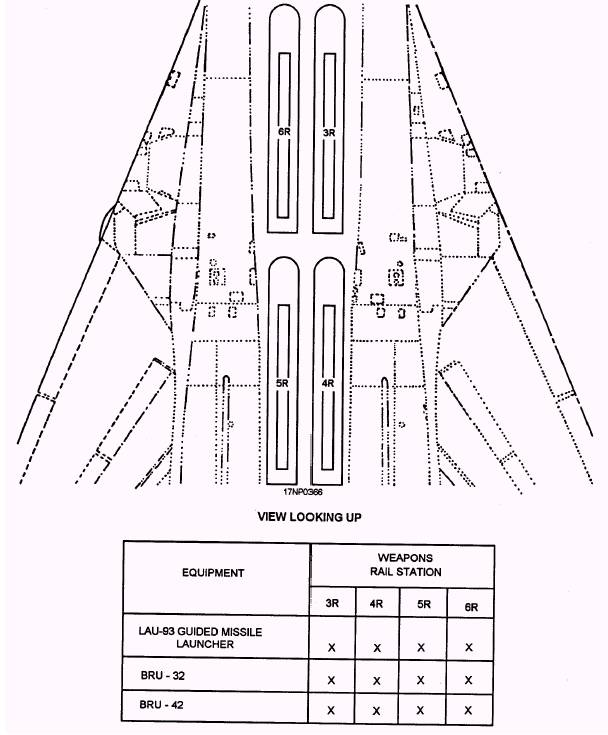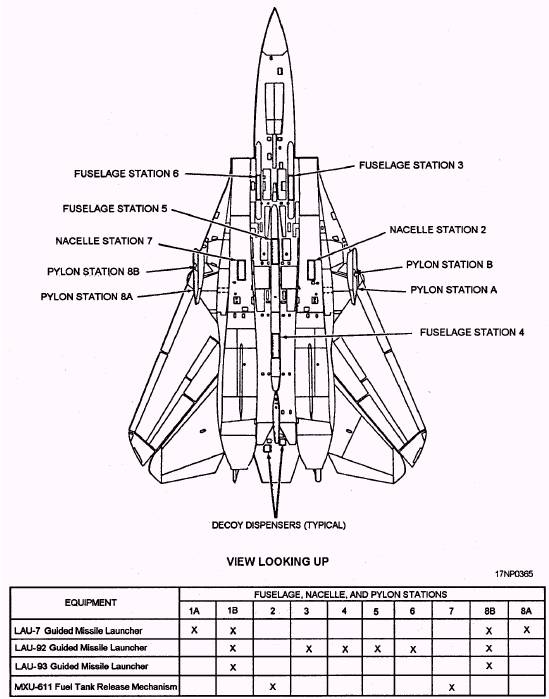 Figure 15-3.-Basic armament configuration. missile launchers and an internally mounted M61A1 For more information on the authorized 20-mm gun. However, the aircraft has a total of eight configurations of aircraft, you should refer to F-14 weapons stations that hold a variety of missile launchers Tactical Manual, NAVAIR 01-F14AAA-1T. If you and weapons rails. Figure 15-4 shows the location of weapons want more information on F-14 weapons systems, refer stations 1 through 8. Figures 15-5 through 15-11 show to Airborne Weapons/Stores Loading Manual, NAVAIR the various station and equipment configurations. 01-F14AAA-75.