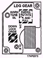 Figure 15-12.-Landing gear control handle. from the main landing gear weight-off-wheels relay to the master arm circuit breaker. Armament Safety Override Switch The armament safety override switch (fig. 15-13) is in the maintenance panel located in the nosewheel well. In the override position, it overrides the landing gear handle DN position so ground operational maintenance can be pulled on the weapon systems. Master Arm Control Panel Assembly The master arm control panel assembly (fig. 15-14) is located in the forward cockpit. It contains the A/A, A/G, and MASTER switches. The A/A and the A/G are push-button switches that provide a ground to the SMP. They select the air-to-air or air-to-ground computer modes, respectively. The MASTER switch is used with the LDG GEAR handle or the armament safety override switch. In the SAFE position, weapons cannot be released or fired, although emergency jettison can be initiated. The ARM position provides an input to the SMP and power for weapon release, fire, or jettison. The switch position (SAFE/ARM) is displayed on the DDIs in the wing-form display.