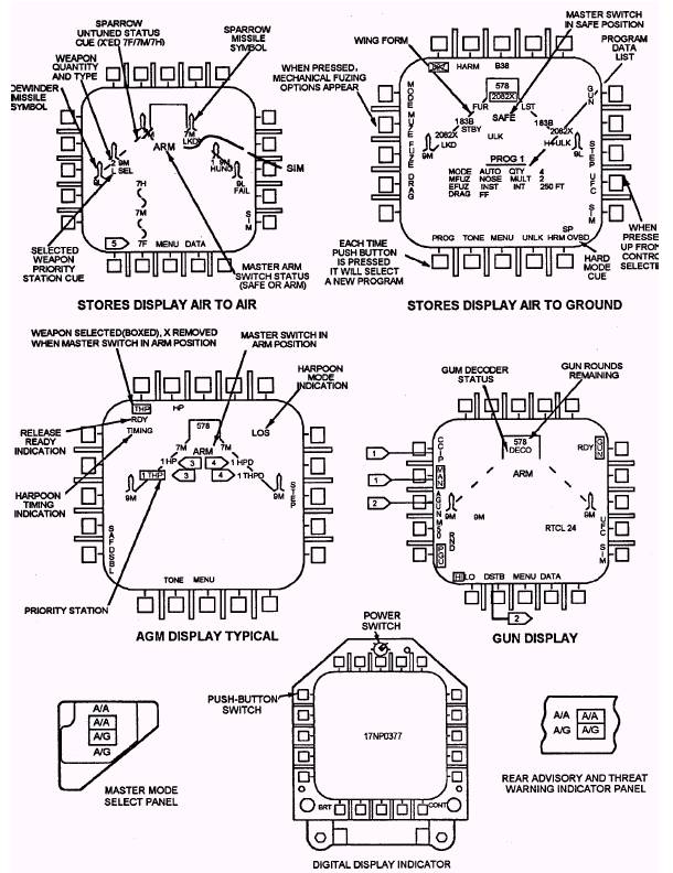 Figure 15-16.-Digita1 display indicators. 15-16 The digital display indicators (DDIs) (fig. 15-16) are located on the rear cockpit instrument panel vertical consoles. The DDIs on aircraft 161354 through 163778 are connected in parallel with the DDIs in the front cockpit and respond to the last action taken by either pilot. Rear DDIs on F/A-18D 163986 and up have independent displays. Armament Computer The armament computer (fig. 15-17) is interfaced with and controlled by the mission computers. The armament computer is also interfaced with and controls the weapon station command encoders-decoders. The armament computer has a weapon insertion panel (fig. 15-18) with code wheels. These code wheels are used to enter the code into the weapon-type (ARMAMENT') and nose or tail fuzes (FUZING). The weapon-type code must match the weapon loaded, and the nose fuze or tail fuze code must be compatible with the weapon or the armament computer won't allow it to release normally. For weapons without nose or tail fuzes, the codes must still match the weapon loaded Two digital computers makeup the mission computer system and control the avionics systems. They interface with the armament computer and allow the armament computer to route power to the encoders-decoders for weapon release. The digital computers are controlled by the MC switch on the MC/HYD ISOL panel. Jettison System The jettison system gives the pilot or crew a way to jettison weapons, stores, launchers, and fuel tanks. The