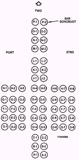 Figure 15-33.-S-3 sonobuoy launch tube arrangement. The distribution box provides the necessary interface between the decoder and the bomb racks in both auto (computer) and manual modes. The decoder contains the necessary electronics for receiving commands from the armament control panel for arming and releasing bomb bay stations and transmitting station status information. Wing Store System The wing store system consists of the units and components necessary for carrying, arming, and releasing external stores. The stores are suspended from two wing stations (fig. 15-35)-W5 (left) and W6 (right). S-3 Pylon and Rack Assembly The S-3 pylon and rack assembly consists of a pylon supporting a BRU-11A/A ejector rack The rack is a self-contained unit that performs all the functions of carrying, arming, and releasing the stores. It is controlled by the aircraft armament circuits. The pylon provides structural attachment between the aircraft wing and the rack. It also contains the necessary wiring and components to connect the rack to release and status indicating circuits. |