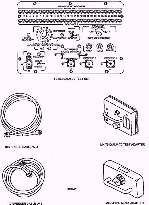Figure 16-5.-TTU-304/E guided missile test set. AN/ALM-70A COUNTERMEASURE DISPENSER TEST SET The AN/ALM-70A countermeasure dispenser test set (fig. 16-6) is used to check the AN/ALE-39 chaff and decoy dispensing system and the AN/ALE-37A dispenser. You connect the test set to the system being checked by test set cables or test set adapters. The test set uses aircraft power for its operation. The AN/ALM-70A test set is used on the A-6, F/A-18, S-3, and F-14 aircraft, and the H-60 helicopter.