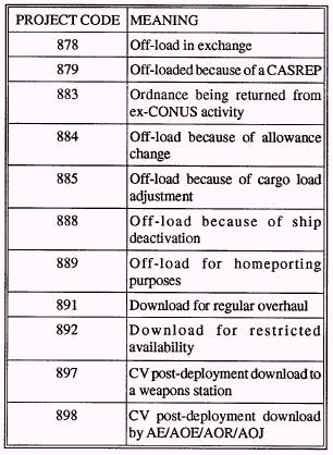 Turn-In of Ammunition Details Ammunition details are devices designed to protect explosives and/or facilitate their handling. They include boxes, containers, pallets and accessories, protective caps, tanks, and brass and steel cartridge cases. Many of these items are expensive to procure. It is essential for ammunition users and support activities to cooperate by ensuring these ammunition details are returned for reuse. NOCINST 8010.2 (series), chapter IV, sections 1 and 2, lists the details and cartridge cases that must be returned. Ships and shore activities outside CONUS that make ammunition expenditures must retain all serviceable or repairable details and, at the earliest opportunity, initiate their shipment to the consignee listed in NOCINST 8010.2. Ammunition details and cartridge cases that are unserviceable or unrepairable should be turned in to the nearest property disposal office as saleable scrap. Each shipment of ammunition details must be accompanied by a DOD Single-Line Release/Receipt Document, DD Form 1348-1, and prepared as follows: DATA BLOCKS 23 AND 24. Enter GP.2. DATA BLOCKS 25 THROUGH 29. Enter 00001. DATA BLOCKS 30 THROUGH 43. Enter the document number. DATABLOCK A. Enter the Service code, UIC, and the name of the activity turning in the material. DATA BLOCK B. Enter the Service code, UIC, and name of the ultimate consignee, if known. DATA BLOCKS U AND V. Enter SHIP TO CONUS AMMO STOCK POINT when the ultimate consignee is unknown. DATA BLOCK X. Enter AMMO INERT ITEMS. DATA BLOCK 2. Enter MC. DATA BLOCK 5. Enter the number of containers. DATA BLOCK 11. Enter Service code, UIC, name, and hull number of the ship/activity where the material will be turned in (when not the final destination). DATA BLOCK FF. Enter CERTIFIED TO BE INERT. DATA BLOCK GG. Enter APPROVED FOR TRANSFER. TEMPORARY STORAGE AND CUSTODY ASHORE Ships occasionally need to off-load ammunition for temporary storage and custody ashore. When this is necessary, the authority to off-load ammunition for temporary storage and custody ashore must be obtained from both the ship's type commander and from the activity where the material will be stored. The number of days of temporary storage must be stated, not to exceed a maximum of 45 days. If more than the maximum period is desired, an extension may be requested from the type commander. For transaction reporting and inventory control purposes, ammunition in temporary custody ashore is considered aboard the ship and is carried on the ship's stock records. Therefore, personnel aboard ship do not submit an off-loading transaction report. Consequently, a receiving transaction report is not submitted when the ammunition is physically returned. In the recent past, confusion has resulted when personnel aboard ship forgot certain items were in temporary custody ashore. Personnel aboard ship must ensure stock record cards are carefully annotated to reflect items in temporary custody ashore. The activity storing the material must keep all ammunition in temporary custody physically separate. This is necessary because the ammunition is not recorded on the activity's stock records as assets ashore. Rework or maintenance is not done on items temporarily stored ashore nor is unserviceable material replaced. The material is returned to the ship exactly as it was received for temporary custody ashore. In summary, the primary advantage of temporary storage and custody ashore is that a ship retains its assets. Personnel aboard the ship do not have to reorder and run the risk of not getting everything ordered. The disadvantages are that items can be forgotten and subsequently lost, or items can become suspended/ unserviceable and require last-minute replacement. DATA BLOCKS 8 THROUGH 22. Enter the NSN of the item. The NSN can be found in TW010-AA-ORD-010/NAVAIR 11-1-116A. DATA BLOCKS 23 AND 24. Enter the unit of issue. Combatants (such as CVs) should always use the abbreviation RD (rounds) for the unit of issue. DATA BLOCKS 25 THROUGH 29. Enter the quantity that is turned in. DATA BLOCKS 30 THROUGH 43. Enter the local document control number. DATA BLOCKS 55 AND 56. Enter the cognizance symbol of the material. DATA BLOCKS 57 THROUGH 59. Enter one of the Project codes listed in table 17-9. When none of the Project codes listed in table 17-9 fit the reason for turn-in, leave these data blocks blank DATA BLOCKS 74 THROUGH 80. Enter the unit price as listed in TW010-AA-ORD-010/NAVAIR 11-1-116A. DATA BLOCK A. Enter the Service code, UIC, name, and hull number of the ship. Table 17-9.-Project Codes