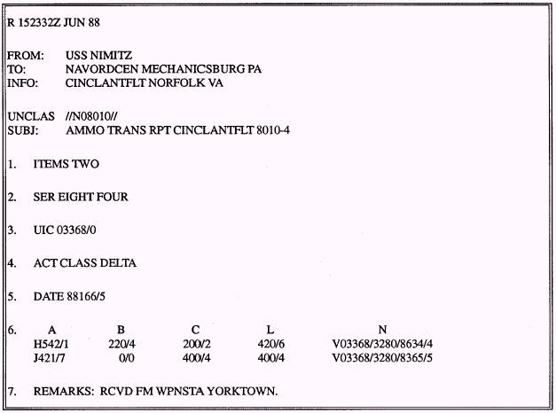Figure 17-14.-ATR showing receipt from a shore activity. number is very important because it provides the only means of tracking/referencing the message after it is transmitted. The message is designated as R (Routine) precedence. The DTG provides you with the date (15), time (2332Z), month (JUN), and the year (88) of the message. The message DTG is assigned by the communications center only after the message has been properly drafted and released. FROM: USS NIMITZ. ATRs are always from the ship/unit submitting the report. TO: NAVORDCEN MECHANICSBURG PA. All ATRs are addressed for action to NOC. INFO: CINCLANTFLT NORFOLK VA. The number of commands addressed for information on an ATR varies. This depends primarily upon the type of transaction being reported. In any case, CINCLANTFLT is always an information addressee. UNCLAS //N08010//. ATRs are either unclassified or classified, depending upon the type of transaction being reported and/or by the information contained in paragraph 6 or 7 of the report. In this case, the ATR is unclassified. The Standard Subject Identification Code (SSIC) is the last element of the classification line, and it is required on most naval messages. The SSIC is derived from SECNAVINST 5210.11 (series). The SSIC consists of a six-character code preceded and followed by two slant signs. It is used as a message processing aid and by communication centers for internal message distribution. For ATRs the SSIC is always //N08010//. SUBJ: (Subject) AMMO TRANS RPT CINCLANTFLT 8010-4. This is the subject line of the ATR AMMO (ammunition) TRANS (transmittal) RPT (report) CINCLANTFLT 8010-4. 1. ITEMS TWO. Two indicates the total number of items reported in paragraph 6. 2. SER EIGHT FOUR. The serial number of the report is 84. 3. UIC 03368/0. The originator's Unit Identification Code. The check-sum-digit procedure was used as previously discussed. 4. ACT CLASS DELTA. This is the ACT (activity) CLASS (classification) line. For an explanation of activity classification DELTA, refer to the activity classifications listed in table 17-10. 5. Date 88166/9. The ATR was submitted on the 166th day of 1988 and the check-sum-digit is 9. 6. This paragraph reflects the NALCs for which the transactions are being reported, the on-hand quantity of items, quantity received, serviceable on-hand quantity, unserviceable/suspended quantity on hand, requisition document number, and narrative remarks. Column A. This column shows the NALCs for which the transaction is reported. The NALC is listed directly beneath column A; subsequent NALCs are located directly under the preceding NALC. NALCs should be arranged in alphanumeric sequence. Remember, the NALC is always a mandatory entry. Column B. This column shows the on-hand quantity of the item as of the last report. The last ATR serial number submitted for a particular NALC can be easily obtained by referring to the Ammunition Master Stock Record Card (discussed later in this chapter). After obtaining the last report for a particular NALC, add the digits in column L (serviceable on-hand) and column M (unserviceable/suspended on-hand) to obtain the sum. This sum provides the total quantity on hand and is entered in column B. Column C. This column shows the quantity received. When all the items under an NALC are shipped from the same UIC, the total amount should be entered in column C. When some of the items under the NALC are received from more than one UIC, an entry must be made in paragraph 7 to show the shipping activities. Column L. This column shows the new serviceable on-hand quantity. The sum of columns B and C provides you with the new serviceable on-hand quantity. Column M. This column shows the unserviceable/suspended quantity on hand. When this quantity has not changed since the last report, no entry is required. When items reported under the NALC have become unserviceable or suspended since the last report, an entry reflecting the new balance must be made under column M. Remember, the quantity added to column M must be deducted from column L. Column N. This column shows the requisition document number of the material shipped. 7. REMARKS: This paragraph contains the name(s) of the activity(ies) that shipped the material. When the material involved in the transaction requires SLIT, the appropriate information is entered in this paragraph. Remember that all numerical entries require check-sum-digit procedures. |