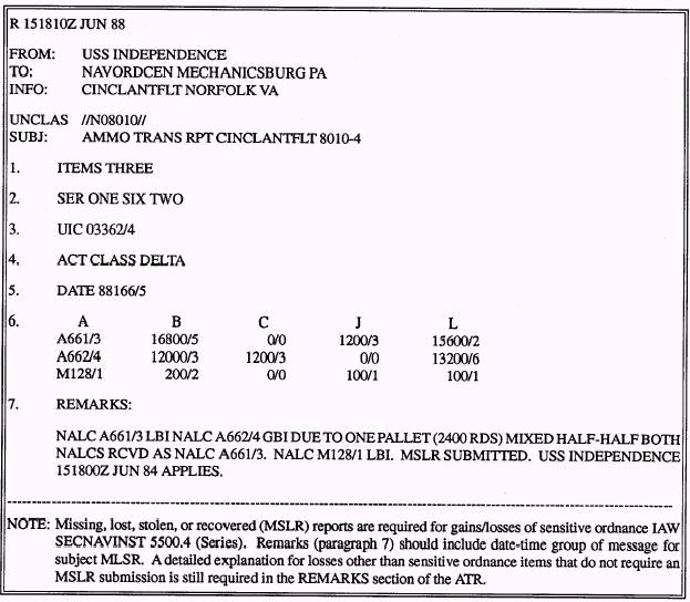 The ATR also shows NALCs A661 and M128 as LBIs. Note that column A lists the NALC, column B lists the total quantity on hand as of the last report, column C lists the quantity received as zero because no material was received, column J lists the quantity LBI, and column L lists the total quantity remaining. The column J quantity must be deducted from the quantity in column B. An entry is made in paragraph 7 of the report showing NALCs A661 and M128 as LBIs. The LBI involving NALC A661 was an error in reporting, and no further action is required. Since the loss of NALC M128 cannot be determined, an MLSR report was submitted and the date-time group of that message is indicated.