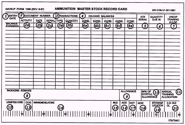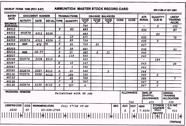Figure 17-20.-Example of a blank Ammunition Master Stock Record Card (NAVSUP Form 1296). BLOCK 8 (PACKAGING REMARKS). Enter the pertinent packaging information, such as 2,000 rounds/case or 50 rounds/box. This entry is not absolutely necessary but is beneficial when you have to do an inventory. BLOCK 9 (ALLOWANCE). Enter the shipfill, mission, load, or cargo load allowance, as applicable. It is possible for a particular NALC to be applicable to two or more allowances. When this situation exists, you must maintain a separate Ammunition Master Stock Record Card for each allowance category. For example, there are presently 20,000 rounds of AO11 authorized aboard the ship. The allowances are 10,000 rounds as shipfill allowance, 5,000 rounds as mission allowance, and 5,000 rounds as load allowance. Although all 20,000 rounds were received in the same shipment and stowed in the same magazine, you still must initiate one Ammunition Master Stock Record Card for each of the three allowance categories. You must ensure expenditures are posted to the correct Ammunition Master Stock Record Card within the correct allowance category. BLOCK 10 (90% OF SHIPFILL ALLOWANCE). Enter the quantity that represents 90 percent of the applicable shipfill allowance (this is for shipfill allowance only). For example, when the shipfill allowance permits an allowance of 20,000 rounds aboard, you are required to maintain an on-hand balance of 18,000 rounds. BLOCK 11 (ANNUAL TRAINING ALLOWANCE). Enter the annual training allowance, as appropriate. BLOCK 12 (LOGISTICS CODE). Enter the NALC as shown in the Stock List of Navy Ammunition, TW010-AA-ORD-010/NAVAIR 11-1-116A. BLOCK 13 (COG). Enter the appropriate cognizance symbol. BLOCK 14 (NIIN/NOMENCLATURE). Enter the nomenclature and other information, such as the NSN. BLOCK 15 (MATERIAL CONTROL CODE). Enter the MCC if a SLIT reportable item (B, C, E). BLOCK 16 (ACC). Enter the appropriate activity Classification code, as discussed previously in this chapter. BLOCK 17 (DOT). Enter the DOT hazard class as indicated in the Navy Transportation Safety Handbook For Hazardous Materials, NAVSEA OP 2165, volume 2. BLOCK 18 (NEW). Enter the net explosive weight (NEW) in this block. NEWs can be found in the Navy Transportation Safety Handbook For Hazardous Materials, NAVSEA OP 2165, volume 2. BLOCK 19 (STOWAGE LOCATION). Enter the appropriate building or magazine number where the materials are located BLOCK 20 (CG HAZ CL). Enter the Coast Guard hazard class as indicated in the Navy Transportation Safety Handbook for Hazardous Materials, NAVSEA OP 2165, volume 2. Figure 17-21 is an example of an Ammunition Master Stock Record Card with several types of actions posted. A few of these entries are discussed in the following paragraphs. The actions discussed are identified in Block 1 (ENTRY DATE) as follows: BALANCE FORWARD. The balance forward line indicates the beginning on-hand balance is 746. Of the 746, none are unserviceable, 150 are allotted for training, and none are on order. ENTRY DATE 84312. This entry indicates that 63 rounds are expended under a type F (training) expenditure. You must deduct the 63 rounds expended from the serviceable on-hand total. This leaves a total of 683 rounds. Since this is a training expenditure, you must also deduct 63 rounds from the unexpended training allowance. This leaves a total of 87 rounds. Now, the ATR serial number on which the transaction was reported is entered. The second entry date of 88312 indicates that 63 rounds are on order (block 6). ENTRY DATE 84350. This entry indicates that the 63 rounds ordered on 84312 have been received. You should enter the document number, the amount received, and add the amount received to the serviceable on-hand total (receipt) in the appropriate blocks. Also, you must enter the ATR serial number on which this transaction was reported. ENTRY DATE 84353. This entry indicates that a notice of ammunition reclassification (NAR) was received. The NAR number is 472-76. This number should be entered in blocks 2a, 2b, and 2c. This particular NAR indicates that Lot BE-68-SJ-55 is suspended. You should refer to the ammunition lot/location card to verify that this particular lot number is aboard. Ammunition lot/location cards are discussed later in this chapter. In this case, there are 21 items aboard with this lot number. Therefore, you must add a total of 21 items to the unserviceable/suspended on-hand column and subtract a total of 21 items from