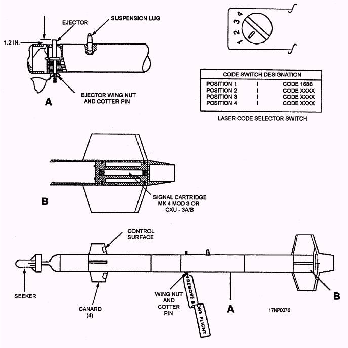 LASER GUIDED TRAINING ROUND (LGTR) The LGTR (fig. 1-45) is designed to provide realistic laser guided bomb (LGB) tactical training. The training round consists of a guidance and control section, pneumatic controls for moveable control surfaces, power supply, and a standard practice bomb signal cartridge. Once initiated, the system cannot be reset. The signal cartridge (spotting charge) is impact initiated and does not require safety or cotter pins.