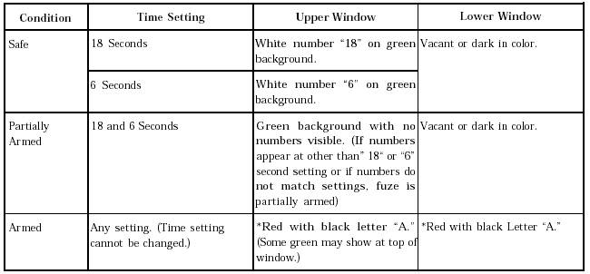 IDENTIFICATION OF ARMED FUZES.- There are three conditions of the M904 fuze-safe, partially armed, and fully armed. You can verify the fuze conditions by looking through the two observation windows in the fuze body (fig. 1-1). To check the fuze condition, hold the fuze vertically and look through the windows perpendicular to the fuze body. Look at Table 1-1.-LDGP and Fire Bomb Cook-Off Times