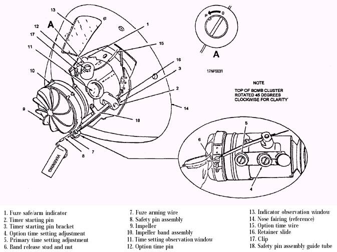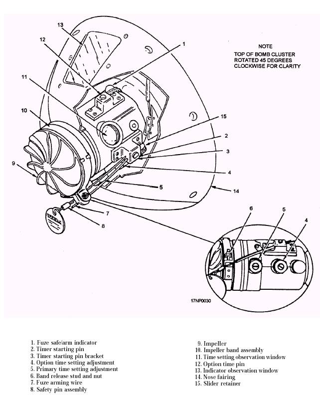 Figure 1-3.-Installed mechanical time fuze Mk 339 Mod 1 (with option time wire bomb clusters Mk 20 Mods 3, 4, and 6. The Mod 0 and Mod 1 fuzes are installed in the Mk 20 Mods 2,3,4, and 6 bomb clusters. The Mod 0 fuze without the option time wire configuration is used only in the Mk 20 Mod 2 bomb cluster. The Mk 339 Mod 0 and Mod 1 fuzes are installed in the bomb clusters during assembly by the manufacturer; therefore, the following information on these fuzes is limited. |