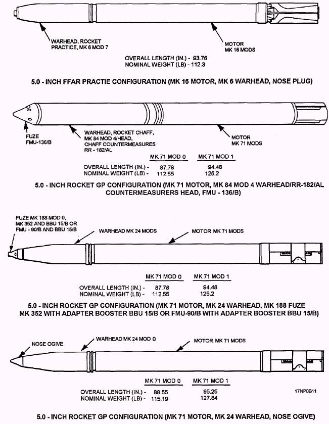 Figure 2-25.-5.0-inch FFAR (typical configurations). table 2-4. For detailed information about the LAU-61 and LAU-68 series launchers, refer to 2.75-inch Airborne Rocket Launchers, (LAU-61 and LAU-68 series), NAVAIR 11-75A-61. Table 2-4.-2.75-Inch Rocket Launchers