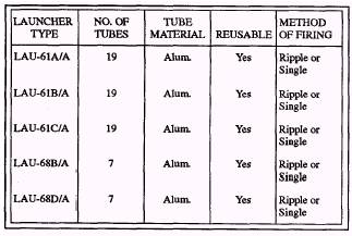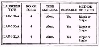 The 5.0-inch rocket launchers are the LAU-10B/A, LAU-10C/A, and the LAU-10D/A. Characteristics and specifications for these launchers are listed in table 2-5. For detailed information on the LAU-10 series launchers, you should refer to 5.0-inch Airborne Rocket Launchers (LAU-10 series), NAVAIR 11-75A-63. Table 2-5.-5.0-Inch Rocket Launchers