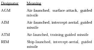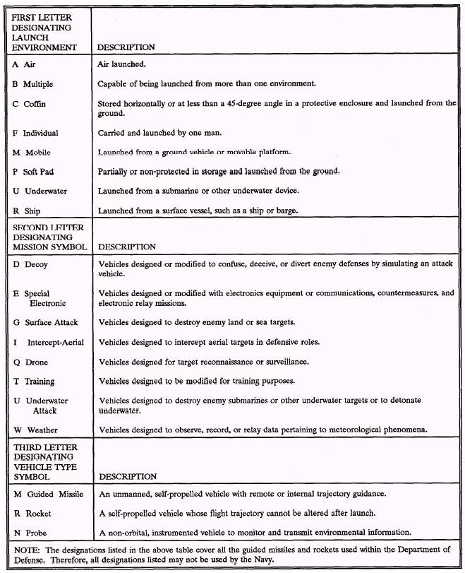 The Department of Defense established a missile and rocket designation sequence. The basic designation (table 3-1) of every guided missile are letters, which are in sequence. The sequence indicates the following: 1. The environment from which the vehicle is launched 2. The primary mission of the missile 3. The type of vehicle Examples of guided missile designators common to the Aviation Ordnanceman are as follows: Basic
