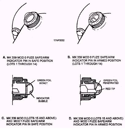 The fuze safe/arm indicator (callout 1 of figs. 1-2 and 1-3) provides external evidence of arming (EEA) for the Mk 339 Mod 0 and Mod 1 fuzes. The fuze safe/arm indicator is viewed through the indicator observation window in the upper nose fairing. Mod 0 fuzes (lots 1 through 14) are in a safe condition when the tip of the indicator pin does not extend into the bubble (fig. 1-4, view A). The fuze is in an armed
