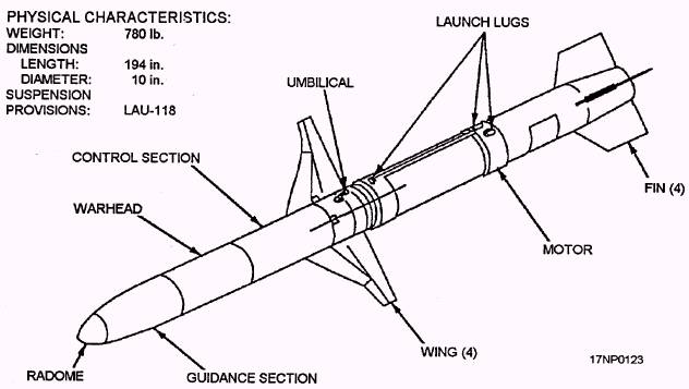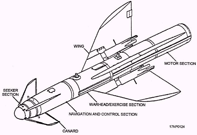 Figure 3-14.-AGM-119B Penguin missile. attached, carries and launches the Penguin missile on command. Sidearm Missile The AGM-122A Sidearm missile (fig, 3-15) is a short-range, air-to-ground, antiradiation missile that is designed to detect, home on, and destroy or disable enemy radar. The Sidearm missile borrows its technology and design from the Sidewinder missile, Currently the Sidearm missile can only be carried on the AH-1 helicopter, but it is being considered for use on other aircraft. |