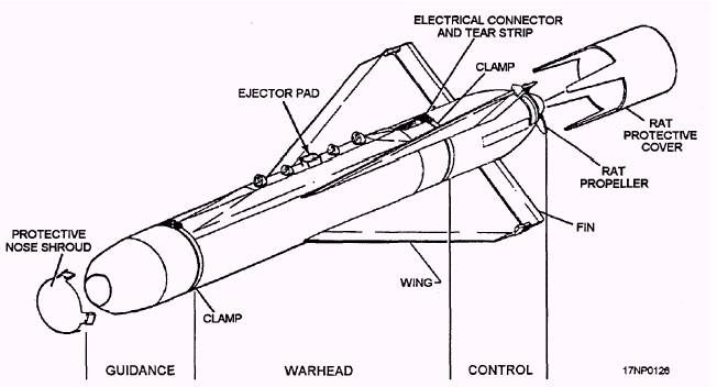 Walleye Guided Weapon The Walleye guided weapon does not contain a propulsion system as do guided missiles. It is included in this chapter because it contains a guidance system, a control system, externally mounted control surfaces, and is listed in the Air Launched Guided Missiles and Components section of Navy Ammunition Logistic Code TW010-AA-ORD-010, NAVAIR 11-1-116A. The Walleye guided weapon system (fig. 3-16) is designed to deliver a self-guided, high-explosive weapon from an attack aircraft to a surface target. The Walleye weapon is issued to the fleet as an AUR. The only assembly required at the organizational maintenance level is the installation of the wings and fins.
