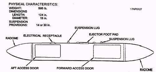 Figure 3-16.-Walleye guided weapon (typical). The weapons are grouped into four basic series-Walleye I (small scale), Walleye I extended range data link (ERDL), Walleye II (large scale), and Walleye II ERDL. Note that the Walleye II and Walleye II ERDL weapons are larger in diameter and length and weigh more than the Walleye I weapon. The Walleye II ERDL weapon also has larger wings. A Walleye weapon representative of each basic series is discussed in this chapter. WALLEYE I.- The Mk 21 Walleye I tactical weapon consists of a guidance section, a warhead section (including the fuze and fuze booster), a control section, four wings, and four fins. The weapon has provisions for 14- and 30-inch suspensions, and an ejector foot pad that is used to adapt the weapons to various types of aircraft bomb racks. The Walleye I (series) weapons are in the 1,000-pound class weapon category. To form a typical attack situation, the weapon, pilot, and aircraft must perform as a complete weapons system. The weapon uses aircraft electrical power (via an umbilical cable that connects the weapon to the aircraft) from the time electrical power is applied to the aircraft until the aircraft reaches a speed of approximately 180 knots. The automatic power changeover circuit in the weapon then switches the weapon to ram air turbine (RAT) generator power. Basically, the guidance section of the weapon and the aircraft system form a closed-circuit television system. A television camera mounted in the nose of the guidance section provides a picture of the area forward of the aircraft and displays this information on a television monitor located in the cockpit of the aircraft. Additional circuits provide a cross-hair grid on the pilot's television monitor, which is a pair of vertical and a pair of horizontal lines. This intersection of horizontal and vertical cross hairs (the square in the middle) defines the tracking area. By looking at the video scene displayed on the television, the pilot is able to boresight the weapon and aircraft to acquire the target, initiate lock-on, and confirm weapon tracking. After boresighting the weapon, selecting the proper fuze option, and achieving satisfactory lock-on, the pilot initiates release and escapes the target area. The weapon continues to track the target until it reaches the point of impact. The Walleye I Mk 27 practice weapon is identical to the Mk 21 weapon except for the warhead and control sections. The warhead is entirely inert, does not contain a fuze or fuze booster, and has ballast to maintain weapon CG (center of gravity) compatibility with the Mk 21 weapon. This weapon is used for captive-flight pilot training and for aircraft loading and ground handling training purposes. For further information concerning the Walleye I guided weapon, you should refer to the Walleye I Guided Weapon, NAVAIR 01-15MGA-1. WALLEYE I ERDL.- The Walleye I extended range data link (ERDL) guided weapon consists of the same basic items as the Walleye I. These weapons are designed to be used in conjunction with the AN/AWW-13 data pod. They permit target information to be transmitted between the weapon and data pod before and after release of the weapon. WALLEYE II.- The Mk 5 tactical Walleye II guided weapon consists of a guidance section, a fairing assembly, a warhead section (including the fuze and fuze booster), a control section, four wings, four fin adapters, and four fins. The weapon has provisions for 30-inch suspension only, and is in the 2,000-pound class weapon category. The Walleye II (series) weapons are essentially the same as the Walleye I weapons except they are physically larger in size and have improved electronics. Functional operation of the weapon and delivery tactics are basically the same as Walleye I. For further information concerning the Walleye II (series) weapons, you should refer to the Guided Weapon (Walleye II), NAVAIR 01-15MGB-2.2. WALLEYE II ERDL.- The Walleye II extended range data link (ERDL) guided weapon Mk 23 Mods 0, 1, and 2 (frequency channels A, C, and E) consists of the same basic items as the Walleye II Mk 5 weapons. However, these assemblies include added data link functions and extended range capability. The addition of the larger wings enables the weapon to be launched with longer slant ranges to a target complex. The addition of the data-link pod (Guided Weapon Control-Monitor Set AN/AWW-9/13) and a joystick controller (guided weapon control group OK-293/AWW) on the aircraft allow the pilot to remotely steer the weapon to a specific target within the complex with pinpoint accuracy. The Guided Weapon Control-Monitor Set AN/AWW-9/13, data-link pod (fig. 3-17), is the communications link between the pilot and the weapon. The pod is suspended from a standard Walleyeconfigured bomb rack. It can be jettisoned in an emergency. The pod contains the necessary electronics to allow the pilot to receive the transmitted video from the weapon and to transmit the command signals to the weapon. In addition, the pod contains a video tape recorder (VTR) that records the video transmitted by the weapon all the way to impact on the target. This allows low-cost weapon performance monitoring, which can be played back for mission evaluation or for training purposes. The weapon system may be used in one- or two-aircraft operations. In a single aircraft operation, the aircraft carries both the weapon and the pod, and the aircraft performs both launch and control functions. In the two-aircraft operation, one aircraft carries the weapon and a second aircraft carries the pod. In this operation, both the launch aircraft and the pod aircraft receive a video picture of the target area from the weapon. After weapon launch, the pod aircraft monitors the flight of the weapon and can update the weapon aim point all the way to impact. Tactically, the two-aircraft operation dominates because of the limited number of available pods. For example, a one-pod configured aircraft monitors 