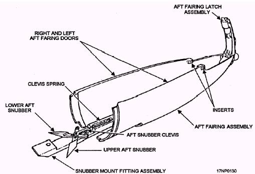 Figure 3-20.-Aft snubber mount fitting assembly, aft fairing assembly, and aft fairway latch assembly. snap over the missile fins to prevent movement during captive flight. Snubber Mount Fitting Assembly, Aft Fairing Latch Assembly, and Aft Fairing Assembly The aft snubber mount fitting assembly, aft snubber assembly, and aft fairing latch (fig. 3-20) are assembled together as a group and mounted to the aft end of the housing assembly. When the aft fairing latch assembly (fig. 3-21) is in the open position you can access the nitrogen receiver. It also releases the aft snubbers to allow missile loading. When in the closed position, it allows the snubbers to spring over the aft missile hanger, locking it in place. For further information on the LAU-7/A (series) guided missile launcher, refer to Guided Missile Launcher LAU-7/A, NAVAIR 11-75A-54.