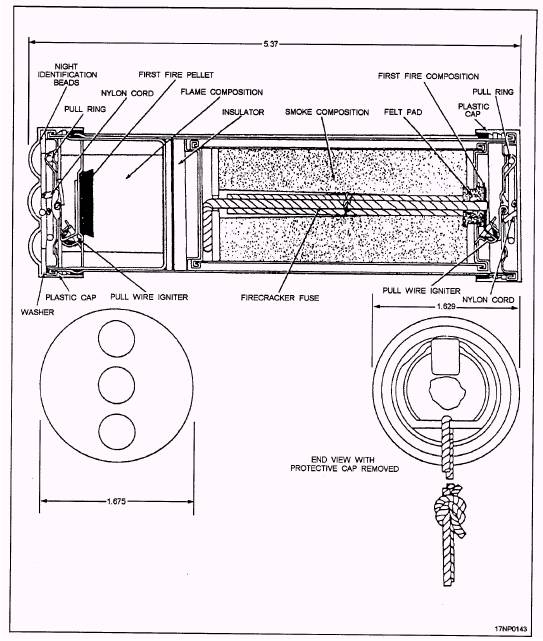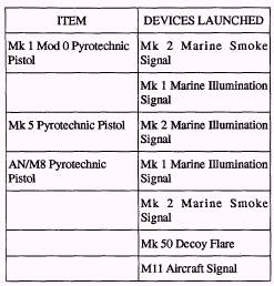 Figure 4-4.-Mk 13 Mod 0 marine smoke and illumination signal. Table 4-1.-Pyrotechnic Pistols and Devices Launched