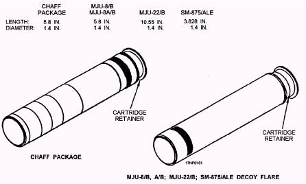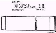 Figure 4-12.-Mk 46 Mod 1, MJU-8/B, A/B, MJU-22/B, SM 875/ALE and chaff package. 4-13 of the flare case opposite the flanged base is closed with an aluminum closure disk. When properly installed in the chamber of a dispenser, the cartridge retainer fits snugly over and around the firing end of a corresponding Mk 131 impulse cartridge. When the cartridge is fired, gas pressure causes the hammer to move into the adapter, locking the adapter and the piston together. Gases from the fired cartridge expand to exert a pushing force against the piston. This removes the closure disk and ejects the flare grain. As the piston strikes the piston stop, the adapter to which the pull wire is firmly attached separates from the igniter cup. Then, the adapter travels with the flare grain. This action causes the igniter to move over the friction material on the crinkled end of the pull wire, igniting the ignition composition. Flame flashes through the longitudinal hole in the flare grain and ignites the first-fire composition in both the longitudinal hole and the cross hole. The first-fire composition ignites the flare grain on all surfaces. The flare is rendered safe during normal handling operations by the segmented adapter. If the closure disk is accidentally displaced, the entire grain and the igniter assembly slips out of the flare case without igniting. The device arms only after an impulse cartridge is fired and bends the sharpened edges of the adapter so it is locked to the piston. PRACTICE BOMB SIGNAL CARTRIDGES LEARNING OBJECTIVE: Identify the purpose and use of practice bomb signal cartridges. Practice bomb signal cartridges are used for day and night operations and as a visual indication of bomb impact and fuze function. Three types of signal cartridges are discussed in this section. Mk 4 Mod 3 signal cartridge. The Mk 4 Mod 3 practice bomb signal cartridge (fig. 4-13) consists of an aluminum case. The rim end has a percussion primer, and the opposite end is sealed with an aluminum disk. The cartridge produces a flash of light and a white smoke puff. The Mk 4 Mod 3 is primarily used for night operations. CXU-3/B and CXU-3A/B signal cartridges. The CXU-3/B and CXU-3A/B practice bomb signal cartridges (fig. 4-14) consists of a cylindrical aluminum case. The case is closed on one end with a percussion primer, and the opposite end is closed with a crimped-in-place aluminum cover (cap). The cartridge produces a dense, white smoke display for day missions. CXU-4/B spotting charge. The CXU-4/B spotting charge (fig. 4-15) is a fire-free signal used with practice bomb BDU 45/B to provide a daytime visual indication of bomb impact point and fuse function.