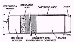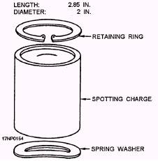 Figure 4-15.-CXU-4/B spotting charge. Pyrotechnic and screening devices are normally equipped with some type of safety pin, lock, or tape that is designed to prevent accidental activation of the initiation mechanism. Do NOT tamper with such equipment. Do NOT strike, bend, or otherwise remove the safety equipment until just before the device is launched Any devices that show signs of damage to the safety features are considered unserviceable; carefully put them to one side and promptly dispose of them according to current directives. If a pyrotechnic device should accidentally ignite, it will result in a fire hazard. In a confined area, the gases generated by this combustion could present a serious toxic hazard. Signaling charges that contain propellant charges, designed to propel the pyrotechnic candle into the air, create an extremely dangerous missile hazard. Pyrotechnic compositions characteristically contain their own oxidants; therefore, they do not depend on atmospheric oxygen for combustion. For this reason, exclusion of air, by whatever means, from a pyrotechnic fire is usually ineffective. Many pyrotechnic mixtures, particularly illuminating flare compositions, burn with intense heat (up to 4,500F). Normally, extinguishers are not useful in this kind of fire. Carbon dioxide extinguishers, in addition to being ineffective, are potential sources of danger because they tend to produce oxygen, which supports the combustion. Foam-type extinguishers are equally ineffective because they work on the exclusion-of-air principle. Water, in flooding quantities and at low pressure, should be used to cool the surrounding area and to prevent the spread of the fire. Properly controlled and directed, water is the best fire-extinguishing agent for aircraft parachute flares burning in the open. Pyrotechnic hazards are frequently increased by such factors as age, improper storage conditions, rough handling, moisture penetration, excessive temperatures, damage to shipping containers, and other mishaps that causes the devices to become unserviceable. In most cases, immediate danger does not exist. Unserviceable pyrotechnic and screening devices on ships at sea are put to one side for normal return to an appropriate shore station for disposition according to the instructions and regulations contained in NAVSEA OP 5, volume 1. Conditions may develop that demand emergency disposal of potentially hazardous devices. In such cases, disposition is the responsibility of the commanding officer. Under NO circumstances, other than an extreme emergency, should ammunition, explosives, or other related hazardous materials be dumped at sea by a Navy vessel, aircraft, or activity without prior approval of the CNO. If, in the commanding officer's best judgement, immediate disposition is necessary to protect lives and property, the commanding officer should order such disposition by the most appropriate means available. In all cases, the commanding officer must notify Naval Sea Systems Command, at the earliest practical time, of the facts and circumstances. |
