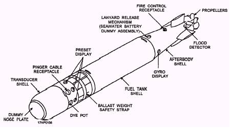 CHAPTER 5 - AIR-LAID MINES AND TORPEDOES Since World War II, the U.S. Navy has developed sophisticated air-launched torpedoes and air-laid mines. These weapons incorporate components so sensitive that their operation is classified information. Therefore, the information in this TRAMAN on air-launched torpedoes and air-laid mines is limited. You will be referred to publications containing detailed information for the weapons discussed throughout the chapter. MK 46 AND MK 50 TORPEDOES LEARNING OBJECTIVE: Identify the purpose and use of the Mk 46 and Mk 50 torpedoes. Recognize the torpedo configurations to include warshot and exercise and aircraft-launched torpedoes. Identify Otto Fuel II. The Mk 46 and Mods torpedo (fig.5-1) is the primary weapon used in antisubmarine warefare (ASW). MK 46 TORPEDO CONFIGURATIONS The Mk 46 Mods torpedo can be assembled into one warshot (tactical) and three REXTORP