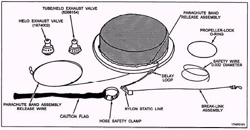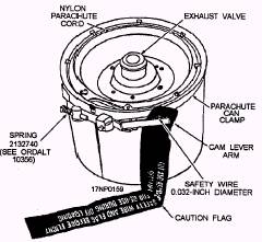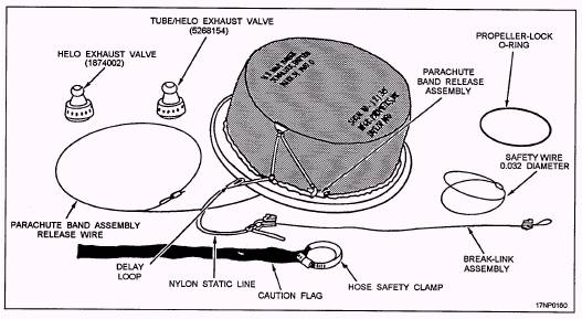 Figure 5-3.-Mk 50 torpedo configurations. The physical characteristics, such as weight, length, etc., of the Mk 46 torpedo vary. These characteristics depend on the configuration of the torpedo itself (warshot or exercise) and the configuration of the attached launch accessories. The Mk 46 torpedo is configured with aircraft-launch accessories for either helicopter or fixed-wing aircraft launching. The basic items of accessory equipment used in launching torpedoes from fixed-wing aircraft and helicopters are the torpedo air stabilizer and suspension band assembly. The torpedo air stabilizer ensures a predictable air trajectory and water entry without torpedo structural damage. The air stabilizer reduces the descent speed of the torpedo relative to the speed of the launching aircraft. A static line or release lanyard deploys the parachute when the torpedo is dropped from the aircraft. The deployed parachute stabilizes the torpedo during descent to the water, slows the descent speed to an acceptable velocity for water entry, and assures the proper water entry angle. The