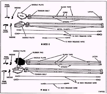 Figure 5-8.-Mk 78 Mod 0 and Mod 1 suspension band assemblies. 5-5 For detailed information concerning aircraft launch accessories, you should refer to the U.S. Navy Aircraft Torpedoes Accessories and Trajectory Data and Quality Assurance Test and Inspection Plan for Installation of Torpedo Mk 46 Launch Accessories, NAVSEA SW512-AO-ASY-010. |