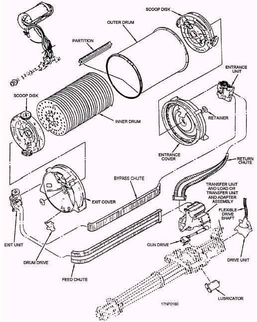 DRUM UNIT ASSEMBLY Live ammunition and expended cases are stowed in the drum unit assembly. This assembly has four major parts-drum unit, entrance cover, exit cover, and scoop disk, Refer to figure 6-12 as you read about these parts. Drum Unit. The drum unit is a cylindrical structure that consists of an outer drum and an inner drum helix, The live ammunition rounds and expended cases are stored radially around the longitudinal axis of the outer drum with their bases in an outward direction. The rounds are suspended by their bases in partitions. These partitions are mounted lengthwise with respect to the inner surface of the outer drum. With the outer drum mounted stationary to the aircraft's structure, the rounds are moved along the length of the partitions by the rotation of the double-lead helix (inner drum), It's easy to understand this movement if you think of the inner drum helix as the threads on a screw. The projectile end of the casing protrudes into the threads. As the inner drum helix is rotated, it produces a screwing-type motion, causing the rounds to slide along the partitions from one end to the other end of the outer drum. Entrance Cover. The entrance cover is stationary mounted to the entrance end of the outer drum. The entrance cover contains a retainer gear and 252 steel ball bearings that support the scoop disks and the inner drum helix. The retainer partitions are mounted to the retainer gear that controls the position of the rounds as they are passed from the entrance cover to the scoop disk. A spring-loaded timing pin on the entrance cover is used to index the drum for installation of the entrance unit. Exit Cover. The exit cover is stationary mounted to the exit end of the outer drum. The exit cover is constructed like the entrance cover. It controls the position of the rounds as they pass from the scoop disk to the exit cover. A spring-loaded timing pin on the exit cover is used to index the drum for installation of the exit unit. Scoop Disk. A scoop disk is mounted on each end of the inner drum helix. Each scoop disk has two sets of sprocket spur gears located 180 degrees apart. These spur gears mesh with the retainer gear in the entrance/exit covers that provide rotating support for the inner drum helix. The sprockets attached to the spur gear transfer rounds from the entrance cover retainer partitions to the drum partitions, and from the drum partitions to the retainer partitions in the exit cover. EXIT UNIT The exit unit is attached over an opening in the exit cover and geared to the exit cover retainer gear. The exit unit contains two gear-driven sprocket assemblies. The sprocket assemblies remove live rounds or expended cases from the retainer partitions in the exit cover and place them in the conveyor elements. Before you install