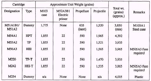 M54A1 HIGH-PRESSURE TEST CARTRIDGE The M544A1 cartridge is used only for proof firing of the gun at the place of manufacture. The projectile is made from a solid steel bar. It has a standard rotating band. The M103 or M103B1 cartridge case is used with the M52A3B1 electric primer. M55A2 TARGET PRACTICE CARTRIDGE The M55A2 cartridge has no explosive filler in the projectile. The solid nose is made of aluminum alloy. The projectile shape and ballistic properties are similar to those of the other M50-configured ammunition. The cartridge is used for practice firing, boresighting weapons, and testing new guns. The M103 cartridge case and M52A3B1 electric primer make up this cartridge. M56A3 HIGH-EXPLOSIVE INCENDIARY CARTRIDGE The M56A3 or M56A4 projectile is used in the M56A3 cartridge. The projectile is loaded with an incendiary and explosive composition, giving the combined effect of the blast of a high-explosive charge plus a fire-starting ability. Both the M56A3 and M56A4 are loaded with aluminized composition A-4. The major difference between the projectiles is their construction, The M56A3 has a baseplate to prevent ignition of the HEI charge by the propellant. The M56A4 does not have the baseplate, and it has approximately 10 more grains of A-4. Both cartridges use the M103 case, M52A3B1 electric primer, and the M505A3 PD fuze. M220 TARGET PRACTICE-TRACER CARTRIDGE The M221 projectile is used with the M220 cartridge. The M221 projectile is similar to the M55A2 projectile, except it incorporates a tracer in the base of the projectile. M242 HIGH-EXPLOSIVE INCENDIARY-TRACER CARTRIDGE The M242 projectile is used with the M242 cartridge. The projectile has a tracer in the base and aluminized composition A-4 in the forward section. It has a combined effect of a high-explosive charge plus a fire-starting ability. The projectile is assembled with the M505A3 PD fuze, the M103 case, and the M52A3B1 electric primer.