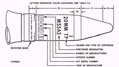 cartridge; for example, 20MM HEI, 20MM TP, or 20MM HEI-T. The second line gives the cartridge designation; for example, M254, M55A2, or M220. The last line consists of a code number that identifies the manufacturer, interfix number, lot serial number, and year of manufacture. The color of the letters has no meaning. The color codes for the M50-configured 20-mm ammunition are listed in table 7-2. You can see exactly where colors are located on the projectile. The projectile (fig. 7-4) is divided into sections marked A, B, C, and D. The sections on the projectile match the color code to columns in the figure. By looking at table 7-2, you can identify high-explosive incendiary-tracer round M242. First, find the projectile and its color code in column A. Then, look at section A of the projectile. This section of the projectile isn't painted; therefore, section A of the projectile remains the natural color of the metal (copper). Look at column B and find the color for section B. Refer to section B of the projectile. This area is painted yellow (high explosives), and section B1 is painted red (incendiary). Use the same procedures for sections C and D. Also note the red T markings in the section B area just outside of the B1 section. The red T, and in some cases orange T, shows the presence of an incendiary explosive (tracer). |