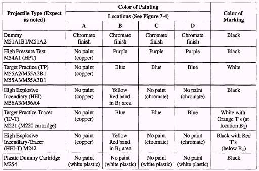 Figure 7-4.-Example of color coding and marking for M50 configuration ammunition. IDENTIFICATION Lettering Ammunition is identified by the color the projectile The lettering (fig. 7-4) is stenciled in waterproof is painted and by the lettering on the body of the marking ink around the body of the projectile. The first projectile. line of lettering identifies the caliber and type of Table 7-2.-Co1or Coding and Marking for M50 Configuration Ammunition