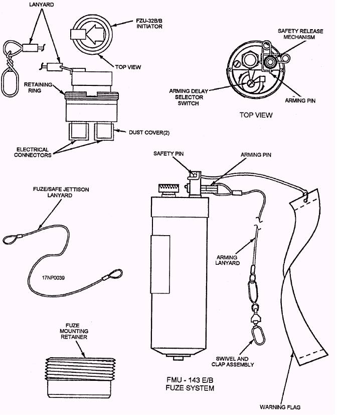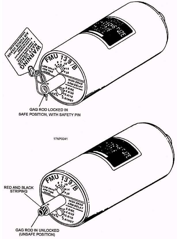 FMU-143E/B ELECTRIC TAIL FUZE The FMU- 143E/B fuze (fig. 1-11) is used with the GBU-24B/B. It is initiated by the FZU-32B/B initiator which is used to generate and supply power to arm the fuze. The safe condition is verified by the presence of a safety pin or arming wire through the pop-out pin (gag rod). FMU-139 (SERIES) ELECTRONIC BOMB FUZE The FMU-139 (series) electronic bomb fuze (fig. 1-12) is an electronic impact or impact-delay fuze. It is used in Mk 80 series general-purpose bombs, including laser guided bombs. The arming times are in-flight selectable, and the functioning delay must be set during weapon assembly. There are three arming times (2.6, 5.5, and 10.0 seconds) and four functioning delay settings (10, 25, and 60 milliseconds, and instantaneous). Only 2.6/60, 2.6/25, 2.6/10, and 2.6/inst high drag arm/delay switch positions are authorized for Navy/Marine Corps use. The low drag arm time switch should always be in the X position. The low drag arm time rotary switch is positioned at X for shipping, storage, and all FFCS (fuze function control set) use. The FMU-139 fuze differs from the Mk 344 and Mk 376 fuzes in that the gag rod and arming wire housing are located in the center of the faceplate (fig. 1-13).