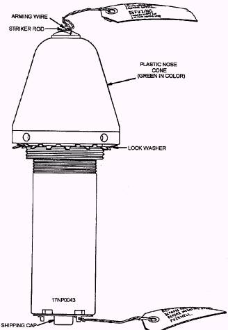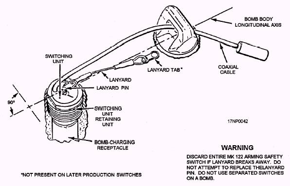 ARMING SAFETY SWITCH MK 122 MOD 0 The Mk 122 Mod 0 arming safety switch (fig. 1-14) connects the fuze control circuits of the bomb in the aircraft to the electric fuze circuits in the bomb. This switch provides an open circuit and a RADHAZ shield to prevent electromagnetic radiation from entering the fuze circuits. While the weapon is loaded, the coaxial cable of the switch is plugged into the receptacle of the aircraft's electrical arming unit. When the bomb is suspended from the rack, the lanyard is attached to a fixture on the rack or pylon. Upon bomb release, the lanyard pulls the lanyard pin and closes the fuze circuit. The lanyard is long enough so the weapon separates from the bomb rack suspension hooks before the lanyard pin is pulled from the switch. This ensures that the fuze does not receive charging voltages in case of weapon release failure. The coaxial cable is longer than the lanyard, which permits sufficient time for the charging voltage to pass from the electrical arming unit on the aircraft to the fuze electric circuits on the bomb before the cable is pulled free or breaks from the arming unit receptacle. NOTE: The Mk 122 Mod 0 switch must be installed and removed in a RADHAZ-free environment. MK 43 MOD 0 TARGET DETECTING DEVICE The Mk 43 Mod 0 target detecting device (fig. 1-15) is a proximity variable time (VT) nose element that gives airburst capability for electric-fuzed Mk 80 (series) bombs. The Mk 43 Mod 0 VT element is compatible with all electric tail fuzes and is identified by the dark green color of the nose cone. Its internal circuitry is powered by a thermal battery. The thermal battery is initiated by +300 volts dc or by the striker rod. The Mk 43 is initiated mechanically (striker rod) only when a delay airburst is desired. This is the alternate method used to provide VT operation when the fuze is not initiated with the +300 volts dc. The conventional VT mode is selected by initiating the fuze with +300 volts dc. When the fuse is initiated with +300 volts dc, the Mk 43 operates automatically.