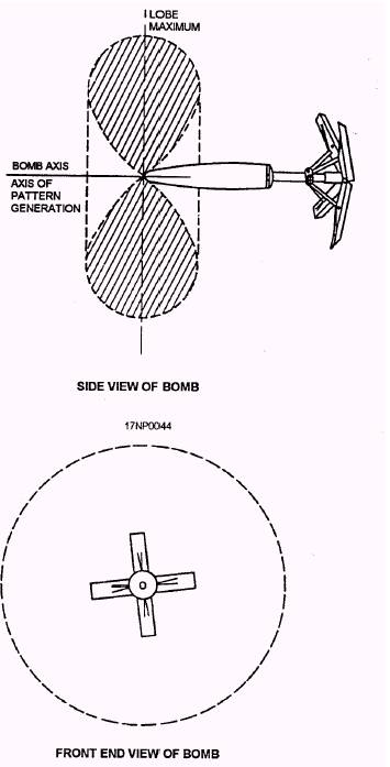 Figure 1-15.-Mk 43 Mod 0 target detecting device. The fuze circuitry produces a lobe pattern. It radiates a pattern at right angles (fig. 1-16) to the longitudinal axis of the weapon. When the Mk 43 is initiated by the conventional method, fuze functioning occurs instantaneously when a firing pulse is received from the thermal battery. If the alternate method is used (striker rod), the fuze is set for either of the two functioning delays-DLY 1 for 0.015-second delay or DLY 2 for 0.100-second delay. Detonation of the bomb is delayed by either 0.015 second or 0.100 second, depending on the delay that is selected.