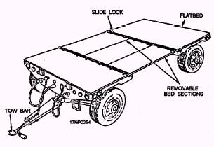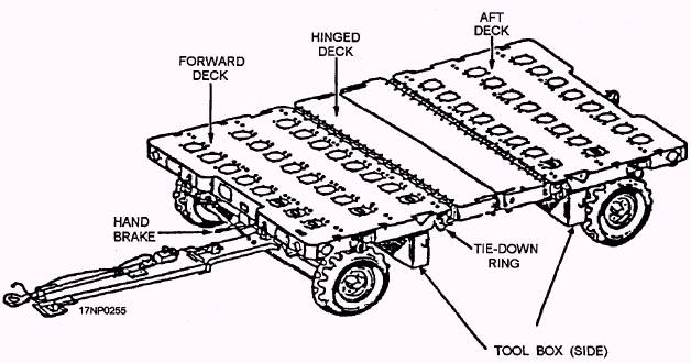 A/M 32K-4A SATS ROUGH TERRAIN TRAILER The A/M 32K-4A SATS rough terrain trailer (fig. 9-60) is a transport vehicle that consists of a chassis and a lightweight, flatbed, aluminum body. The chassis has two axles and four single wheels that are equipped with pneumatic tires. A torque box provides strength and rigidity to the body. You can remove two sections of the