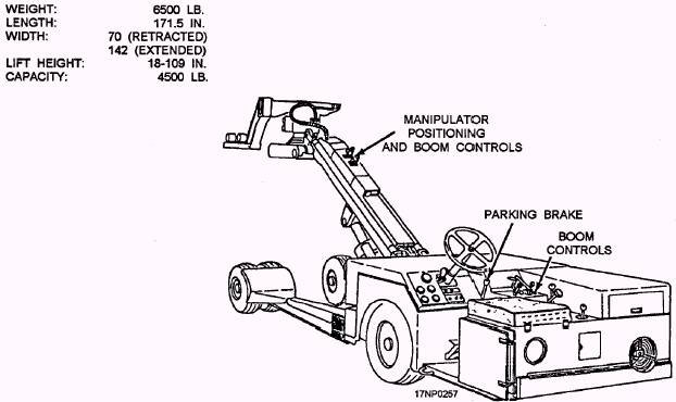 AERO 47A, AERO 47A-1, AND MJ-7 WEAPON LOADER The Aero 47A, 47A-1, and MJ-7 weapon loaders (fig. 9-63) are self-propelled vehicles with low, heavy-duty frames. Each weapon loader's frame is supported by six small high-capacity wheels. Each vehicle consists of two main functional components- the lifting mechanism and the drive mechanism. The lifting mechanism has a lift boom, hydraulic system, and a manipulating head. The lift boom is operated by a piston-type hydraulic cylinder mounted in