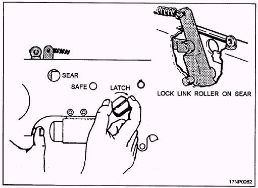 Cocking and Latching Before you load a weapon on the Aero 65A bomb rack, cock and latch the bomb rack linkage assembly. To cock the bomb rack, you must insert a cocking lever assembly in the hoist bracket mounting hole (fig. 10-4). Pull the assembly back until the release unit plunger compresses. To latch the linkage assembly, turn the latch knob as far as it will go in the direction away from the arrow. (This ensures the linkage is aligned for latching.) Then, turn the latch knob in the direction of the arrow (fig. 10-5). Press the release bell crank forward until the sear roller rises above the sear. Then, return the release bell crank to its normal position. If the sear roller does not rest on the sear or is not visible above the sear, rotate the latch knob in the direction away from the arrow to force the sear roller down. The suspension hooks close independently of each other. During loading of a weapon/store, the lugs pivot the hooks on the hook pins to the closed position. You must inspect the hook latch inspection holes to verify that the hook latch pins are securely held in the hook latches. The hook latches and the ends of the hook latch