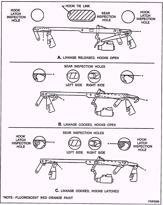 Figure 10-6.\Released, cocked, and latched configuration of the Aero 65A bomb rack. pins are marked with fluorescent red-orange paint for easy visibility. When the hooks are latched, the painted areas are aligned, as shown in figure 10-6. Operation Weapons are armed mechanically and released either electrically or manually. ELECTRICAL RELEASE.- The electrical release unit is energized through the bomb rack electrical cable assembly by a 28-volt dc power supply, which is located in the aircraft's weapons control system. When power is applied, the release unit plunger strikes the release bell crank Through the connecting link, the sear link rotates to free the lock link As the hook latches move forward, the hook springs and hook-latch springs pull the suspension hooks open. The front hook comes to rest against the hook stop, and the latches are cammed-up out of engagement. The lock link is held against the aft link by the lock link return spring. MANUAL RELEASE.- The sequence for manual release is the same as for electrical release, except that the release bell crank is actuated by the manual release cable. The manual release cable is routed from the aircraft and connected to the manual-release cable assembly of the bomb rack ARMING.- A 28-volt dc power supply from the aircraft's weapons control system provides voltage to energize the two arming solenoids. These solenoids electrically control mechanical arming, The arming units are energized individually or simultaneously. When the arming units are energized, the arming wires remain in place. The store is armed as it falls from the bomb rack, When the solenoids are de-energized the store pulls the wires free of the bomb rack, and it isn't armed. If you want more information about the Aero 65A series bomb rack, refer to Bomb Rack Models Aero 65A Series, NAVAIR 11-5E-50. |